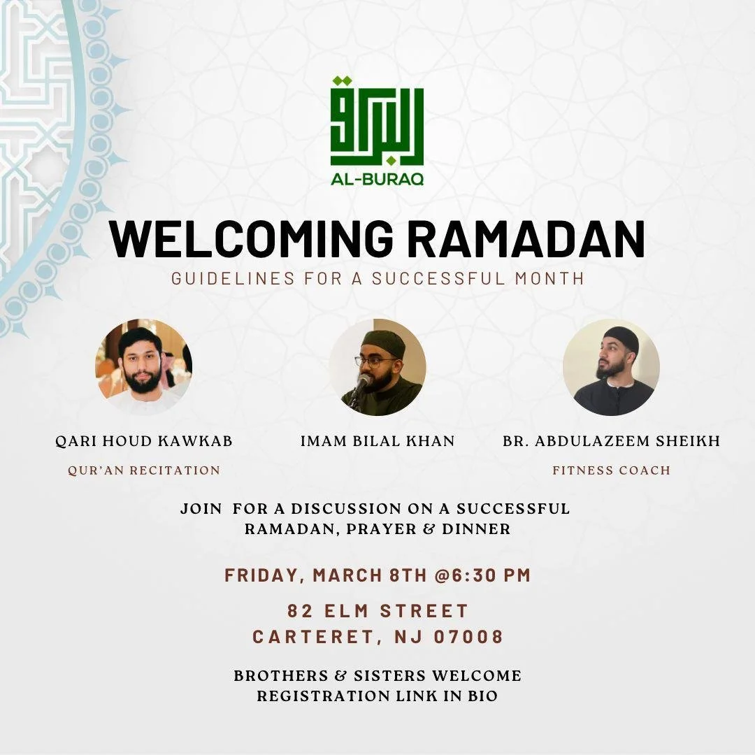 Join us on Friday, March 8th at 6:30PM for our annual Welcoming Ramadan event! We’ll be enjoying beautiful Qur’an recitation, activities & and a discussion on guidelines for a successful physical & spiritual month with Qari Houd Kawab, Imam Bilal Khan and fitness coach, Brother Abdul Azeem Sheikh. Dinner will be served.